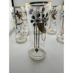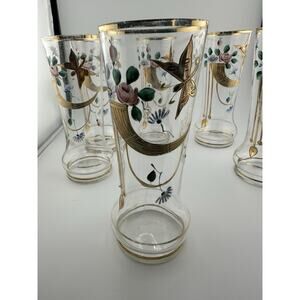 Beautiful set of antique, Bohemian made, hand painted and enameled glasses. This is a set of 6, they were usually used for lemonade. They are extremely delicate and thin. They were decorated in a classical art nouveau style with gold gilt draping and butterflies. There is gold gilding bands around the rims and interior. They measure 6" tall and 2.25" wide. They date to the late 1800s to early 1900s. Condition is good, there is some loss of the gilding and one glass has a small chip and discoloration on the inside. Please look at photos!! I will only refund if they are damaged in shipping. These are antiques and show their age and usage.