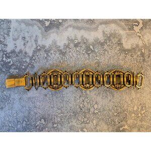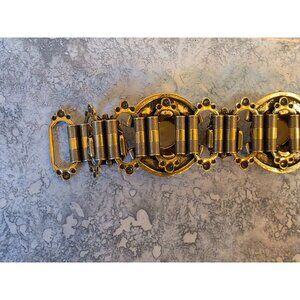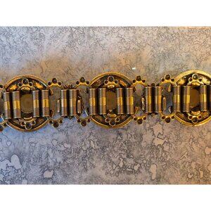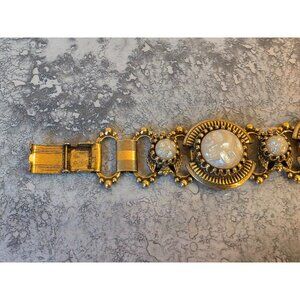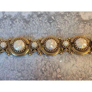 This vintage bracelet showcases an elegant gold-tone finish combined with faux pearl accents. Its intricate spring design adds a unique, timeless aesthetic.