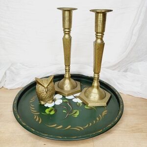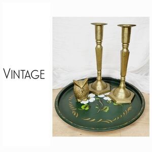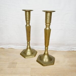 Antique solid brass candle stick holders with etched floral design.