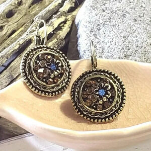 Antiqued brass Art Nouveau style earrings feature blue and brown acrylic rhinestones