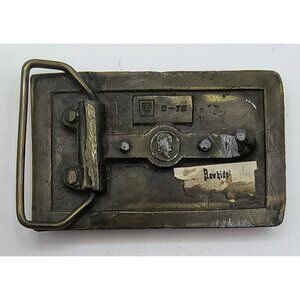 A vintage brass belt buckle showcasing a detailed rustic scene with figures and a countryside backdrop. A timeless accessory with historical charm.