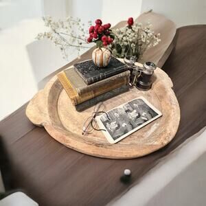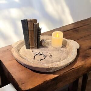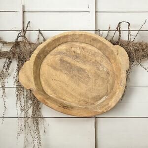 Add timeless rustic charm to your home with this authentic antique hand-hewn wooden bread bowl. Traditionally known as a parat bowl, this piece was hand-carved from solid wood and used for kneading dough in Indian kitchens. Its primitive craftsmanship, natural wood grain, and aged patina make it a stunning decorative accent for any farmhouse, boho, modern, or vintage-inspired space. *Decorations in bowl not included in purchase*