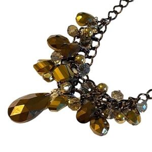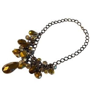 This gorgeous necklace with an antique bronze tone chain and a variety of sparkling smooth and antiqued faceted amber colored beads and jewels will instantly elevate your look!