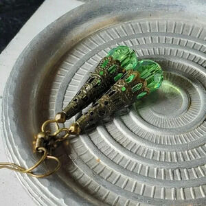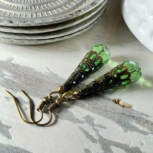Antique Bronze Filigree Faceted Spring Green Crystal Teardrop Earrings