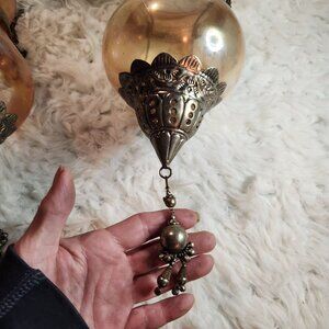 These exquisite vintage hanging lanterns meld the rustic charm of bronze with the ethereal glow of carnival glass. The intricate metalwork and the delicate chain add a touch of old-world elegance to any setting. Perfect for adding ambient lighting to a cozy corner.