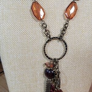 Boho chic statement necklace with antique bronze tone metal chain accented with beads in shades of amber. A hammered metal ring with mixed beads and Chain Tassels complete the design. Lobster clasp closure.