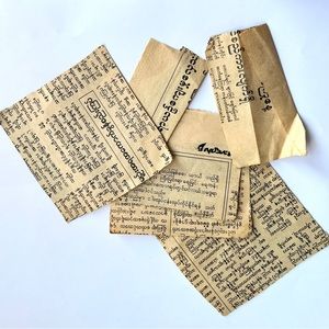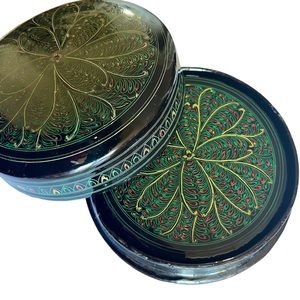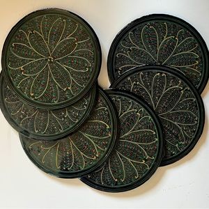 Set of Six Coasters in Decorative Box. Great gift! These handmade coasters and case are very old. Made in Myanmar (formerly Burma) with materials and patterns typical of antique Burmese items. Black Lacquer Box with Intricate Colorful Inlaid Design. Each coaster measures 4” diameter. The box measures just under 4.75” diameter by about 1.75” H. These were acquired as a part of the antique estate of a world traveler and the yellowed strips of newspaper were found underneath the coasters.