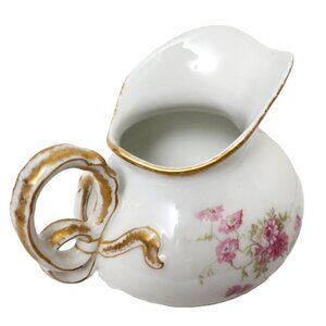 CH Field Haviland Limoges GDA France Floral Porcelain Cream Pitcher with Gold Leaf Rim Open Handle Twirling Ribbon Detail. 4.25” x 3” x 3”