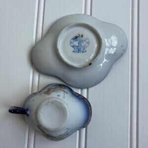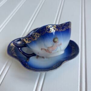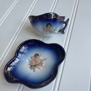 Antique Carlsbad Austria Porcelain Teacup Saucer Set Cobalt Blue Cherub 1800's