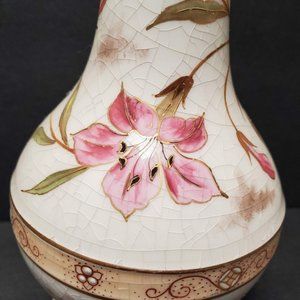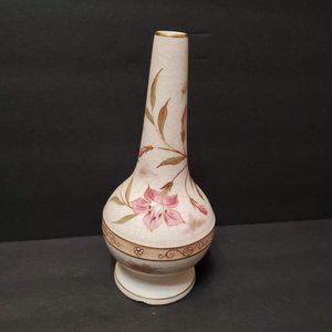 Antique Porcelain Vase stamped Carlsbad, Hand Painted with a Floral Design and Gold Trim. Beautiful delicate piece with lovely detail in the painting that was all done by hand. Carlsbad porcelain was made in Austria, Bavaria and Germany in the late 1800s and early 1900s. It does have a chip on the rim of the base (not noticeable when the piece is standing upright), and the porcelain is quite crazed due to age, but otherwise in very good condition. It stands about 9 inches tall and 4 inches wide.