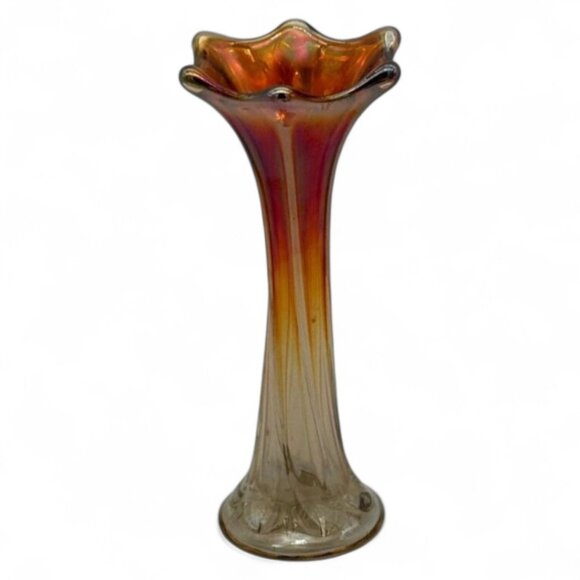 Antique Carnival Glass Bud Vase Iridescent Marigold 7.5" Tall Swirl Design