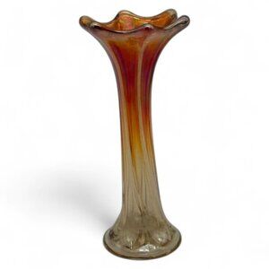 This antique carnival glass bud vase features a captivating iridescent marigold hue and fluid swirl design, embodying the charm of early 20th-century craftsmanship. Standing at 7.5 inches, its petite stature adds a touch of elegance, making it a cherished addition to any vintage glass collection or a refined decorative accent.