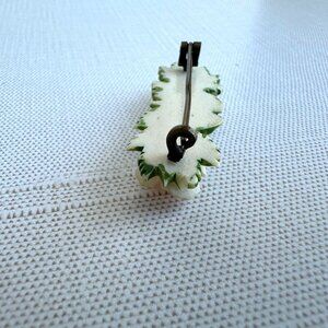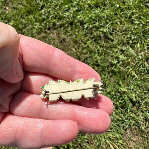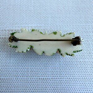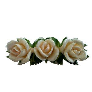 This antique carved celluloid brooch features three delicate ivory roses with hand-tinted green leaves. Likely dating to the 1910s–1930s, this early plastic pin demonstrates the fine craftsmanship typical of celluloid jewelry of the era. The back includes an aged brass pin and clasp, and the piece retains its soft ivory color with subtle surface patina.