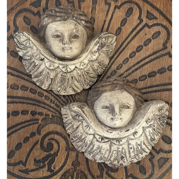 This beautiful pair of hand-carved wooden cherub / putti heads came from an antique European architectural salvage collection. Crafted from solid wood with gesso and aged paint, these angelic faces were originally part of a church or chapel interior—likely mounted on an altar surround, choir loft, or decorative frieze during the late 19th to early 20th century.
