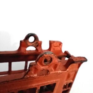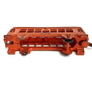 This is an all original vintage train car made from cast iron. It has the original orange paint and does have some chipping as shown in the photographs. One of the wheel sets is missing. The train car is marked 402. It is 7 ¾ inches long, 1 ¾ inches wide, and 2 ¾ inches high. This is a great old toy from the 1930s.