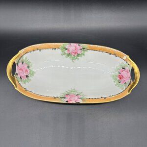 Antique Celery Dish Serving Bowl Bavarian Hand Painted Pink Roses Gold Floral