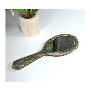 Beautiful Antique Art Deco Celluloid hand-held tabletop mirror in a Rare Gray Pearlized finish. Elegant beveled glass mirror and a nice heavy weight and quality crafted feel . Excellent condition. It measures approximately 12" inches long and 4 1/2" wide.