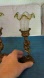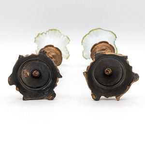 Antique Cherub Candle Holders Gilt Bronze w Hand Blown Ruffled Glass Green Rim