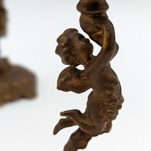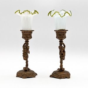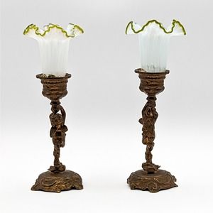 Antique Art Nouveau Cherub Candle Holders Gilt Bronze with Hand Blown Ruffled Glass Green Rim