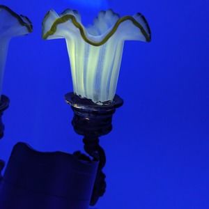 This small pair of cherubs is ornate and elegant. The opalescent striped glass shades with green rim might not have been original but are from the same period. The blacklight photo shows that the shades glow with a 365 blacklight. (Not sure about a "regular blacklight.) It's "gilding" looks more like a copper finish over bronze, which you can see well in some of the photos. My guess is that these are Italian in origin. An awesome find for a Victorian, Art Nouveau, or Maximalist decorator or collector,