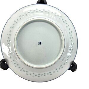 This exquisite antique Chinese porcelain dinner plate with rice grain pattern showcases a detailed dragon motif in blue, surrounded by a decorative border in blue and red on white background. Crafted in chinoiserie sytle with precision, the plate is not only a stunning piece of art but also a testament to Chinese craftsmanship. Rice grain pattern gives it a texture on the back.