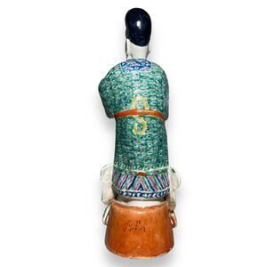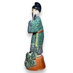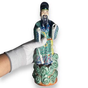 This antique Chinese porcelain figurine is a captivating work of art, showcasing a standing figure without handslikely one of the Eight Immortals riding the waves to symbolize his magical powers. Dating back to the 1900-1940 era, this original piece is a valuable collectible, ideal for display in any home or gallery. Standing at 10.5 inches tall, the figurine features meticulously hand-painted details, reflecting the artistry and craftsmanship of the period. A must-have for collectors of Asian antiques and porcelain enthusiasts, this figurine adds timeless elegance and cultural depth to any collection.