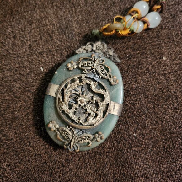 Rare & Beautiful original Chinese Jade green thick Peking glass disk pendant with amazing fine brass filigree work with a Dragon on one side & a Phoenix with butterflies floating around them.