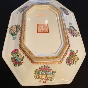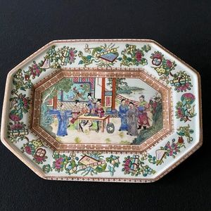 This antique Chinese octagonal (8 sided rectangular shape) porcelain plate is hand painted and enameled in relief. It is from the Qing Dynasty (1644 to 1911). The Qing Dynasty was the final imperial dynasty in China, and I believe this plate is from the period led by Emperor Qianlong.
