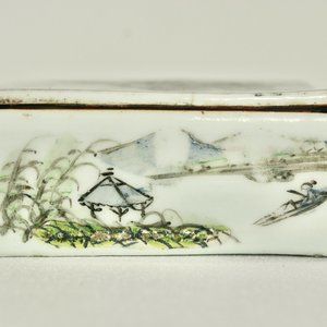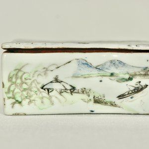 An antique ceramic box with a lid with beautifully painted landscapes and skillfully written calligraphy is a treasure to be cherished for years to come.