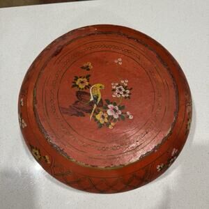 Antique Chinese Red Lacquer Round Wedding Box Floral Bird 13” Diameter