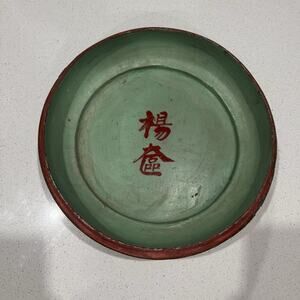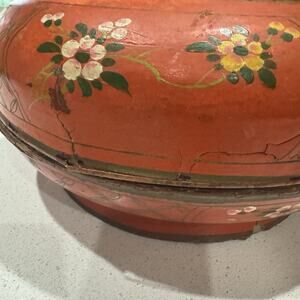 Chinese wedding basket antique round two piece top and bottom stands roughly about 6 1/2 inches tall and about 13 inch diameter. There are cracks and dings two softer areas on the lid because of the cracking has an original sticker on it. I’m not sure what it says, but the color is really beautiful. It’s an orange red with a bird on top unknown age or a region that it comes from.