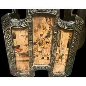 A striking pair of antique Chinese Shantou metalware featuring a teapot (7.5" x 5.25" x 2.25") and tea caddy (7" x 4.25"). Both are crafted with ornate repoussé metalwork and inset lithograph glass panels, each decorated with vivid traditional Chinese scenes. Produced in Shantou, China, during the late Qing to early Republic period (c. 1890–1920), these pieces exemplify export wares prized for their artistry and storytelling imagery. The tea caddy features multi-sided glass panels framed in detailed metalwork. Together, they capture the spirit of late 19th–early 20th century Chinese decorative arts and are ideal for display in eclectic, Bohemian, or Chinoiserie-inspired interiors. A rare and beautiful set for collectors of Asian antiques or vintage tea culture.