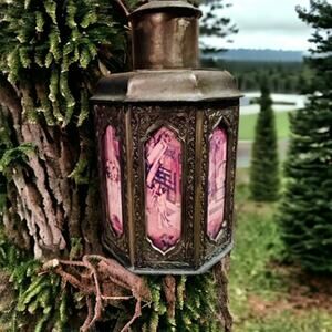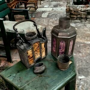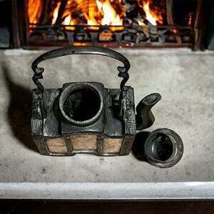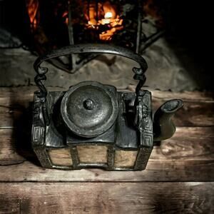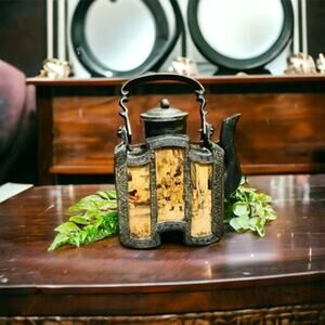 **Please note…The item featured is not new…it is antique and therefore will have some of the imperfections that are expected with age and history. No feet on the bottom of the teapot. Patina and oxidation noted that is typical of older metal objects. Some cloudiness around outer edges of glass panels. Please inspect all the photos carefully prior to purchase to ensure item meets expectations. Thank you!**