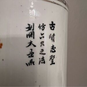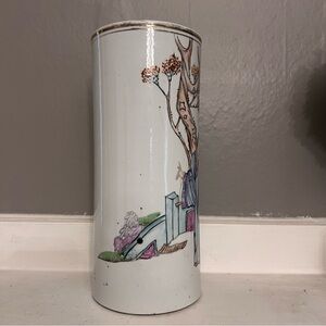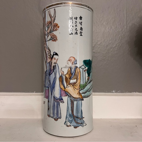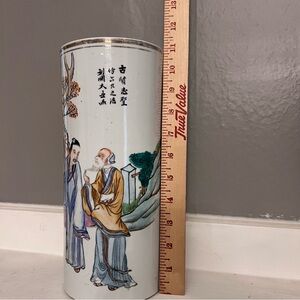 EUC antique Chinese vase or brush pot or hat stand. Normal wear to gold trim at upper edge. Unsigned. Classic scenic drawing with dignitaries.