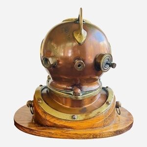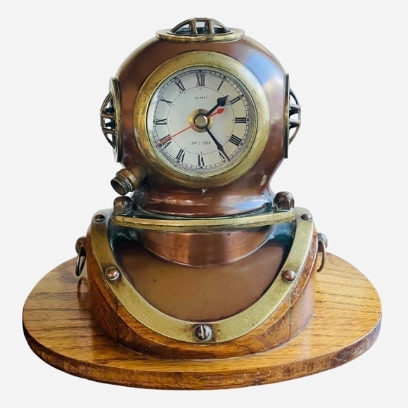 Discover this exquisite #AntiqueClock, a unique blend of historic charm and nautical history. Crafted with a #BrassCopper diving helmet design, this maritime quartz clock is reminiscent of the #USNavy's storied past. The body is a harmonious mix of metal and #SolidWood, displaying an aged patina that enhances its vintage allure.