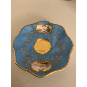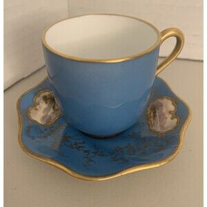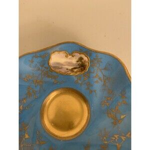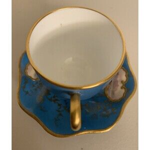 Antique Coalport Demitasse Cup & Saucer, Handpainted Mountain & water Scene. Gold Gilded on the handle, center of saucer, the rim of cup and saucer, and foot of cup. The scrolling design on saucer is gilded too.