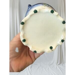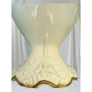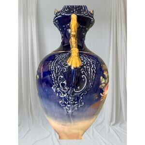 This stunning antique cobalt blue urn vase dates from approximately 1890–1920 and features richly raised floral artwork, gold gilt handles, and detailed embossed scrollwork around the neck. The deep flow-blue upper body beautifully transitions into a soft ivory base, creating a classic Victorian color gradient. The hand-painted florals include textured enamel accents and intricate gold detailing. The vase stands on a decorative scrolled pedestal foot and displays typical age characteristics such as light gilt wear and glaze imperfections, with no major chips or cracks noted. Unmarked, as was common with Austrian, German, or French decorative ceramics of the period, it presents exceptionally well as a statement piece for mantel, entryway, or antique display. A beautiful example of early 20th-century European craftsmanship and ornate home décor.