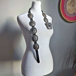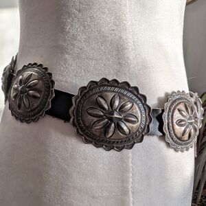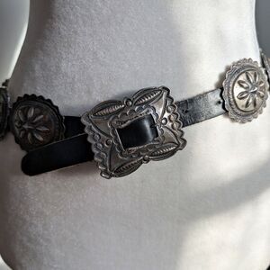 Historic antique/vintage second phase coin ingot silver concho belt. Ten conchos on belt. Belt dates back to 1890s to early 1900s. No hallmarking, concho pieces hand stamped from silver coins. Soldered copper straps on back of conchos. Original leather belt. Navajo/southwest origin. Repoussé metalworking- technique uses hammering to create a raised design on front of concho.