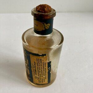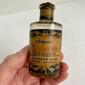 There's a little chip in the glass on the top edge. Label shows some wear but is still intact. Looks to be the original cork stopper (but chewed up a bit on the top). Very rare old Colgate & Co. bottle. Ships quick!