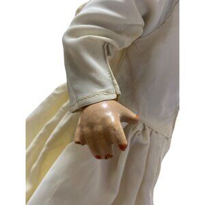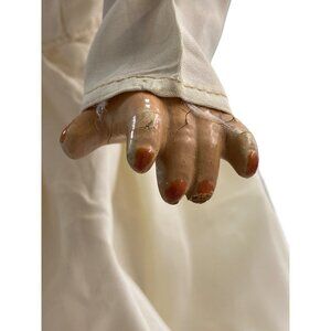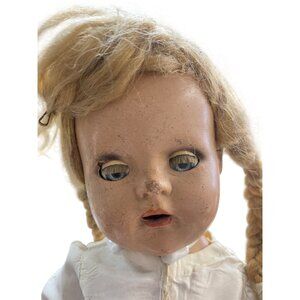 Antique composition doll perfect for spooky Halloween decor. This haunted toy adds a creepy vintage charm to any setting. Ideal for collectors or horror enthusiasts. Display it as a unique conversation starter.
