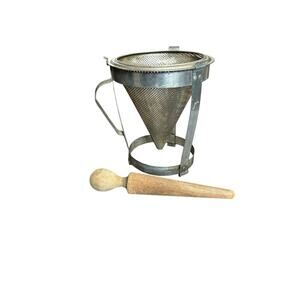 Antique Cone Sieve Food Mill Strainer on Tripod w Wood Pestle Masher some rust. This a neat piece! It does have some rust as shown in the pictures.