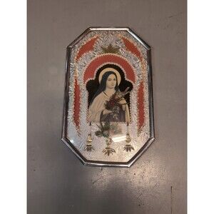 Antique Convex Glass Wall Picture St. Therese Of Lisieux or perhaps Virgin Mary Icon Guessing it dates to the 1930s, looks Mid Century MCM - Metal Frame. Measures approx.18-1/4"x11-1/4" - Really a beautiful portrait. Nonsmoking home.