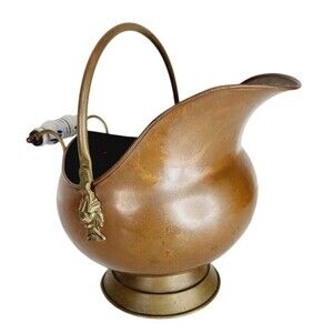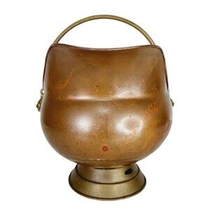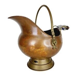 keywords: antique, vintage, copper, brass, bronze, metalware, vintage metalware, delft, collectible, scuttle bucket, spout, handle, pitcher, bucket, container, water bucket, fireplace accessories, vintage fireplace accessories, lion head, baroque, rococo, vintage brass, vintage copper, coal, hot ash,