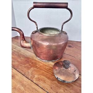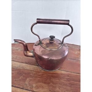 Antique copper gooseneck tea kettle pot, with solid copper handle. Condition is used showing age and has some pin holes. Not  functional due to pinholes and corrosion, still makes a beautiful display as an antique kitchen collectible Selling as found, handle and spout are sturdy, see all pictures for more details or. Ask questions.