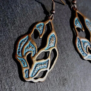 Antique Copper Verdigris Blue Green Patina Artsy Textured Open Leaf Earrings