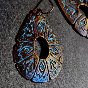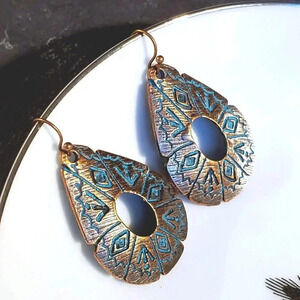 Antique Copper Verdigris Blue Green Patina Carved Open Teardrop Earrings