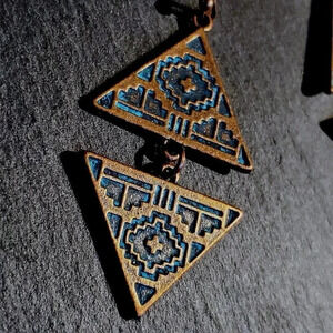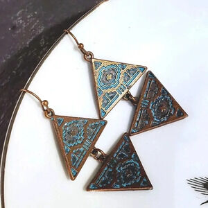 Antique Copper Verdigris Blue Green Patina Double Carved Triangles Earrings