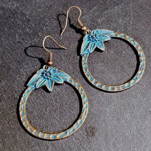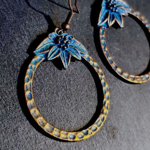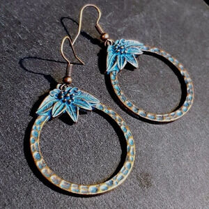 Antique Copper Verdigris Blue Green Patina Hammered Open Round Leaves Earrings