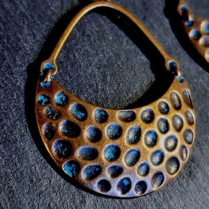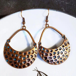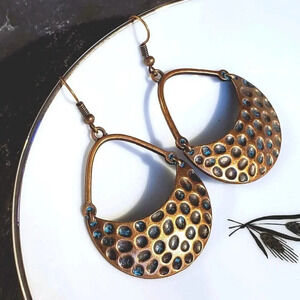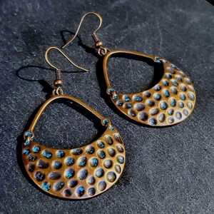 Antique Copper Verdigris Blue Green Patina Hammered Open Teardrop Earrings