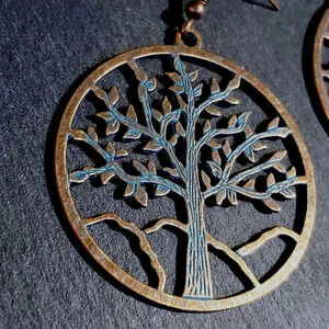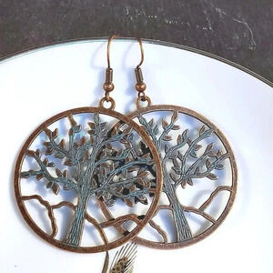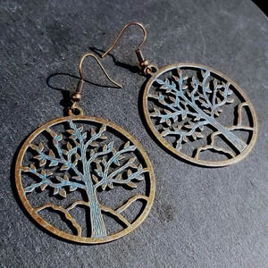 Antique Copper Verdigris Blue Green Patina Open Tree of Life Earrings